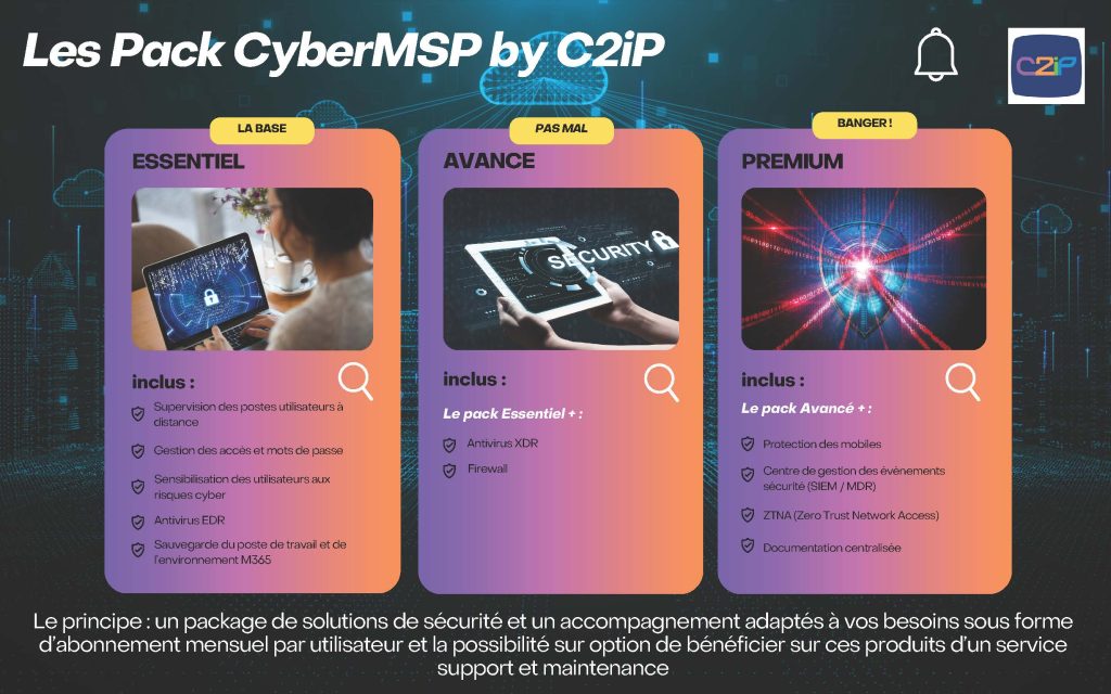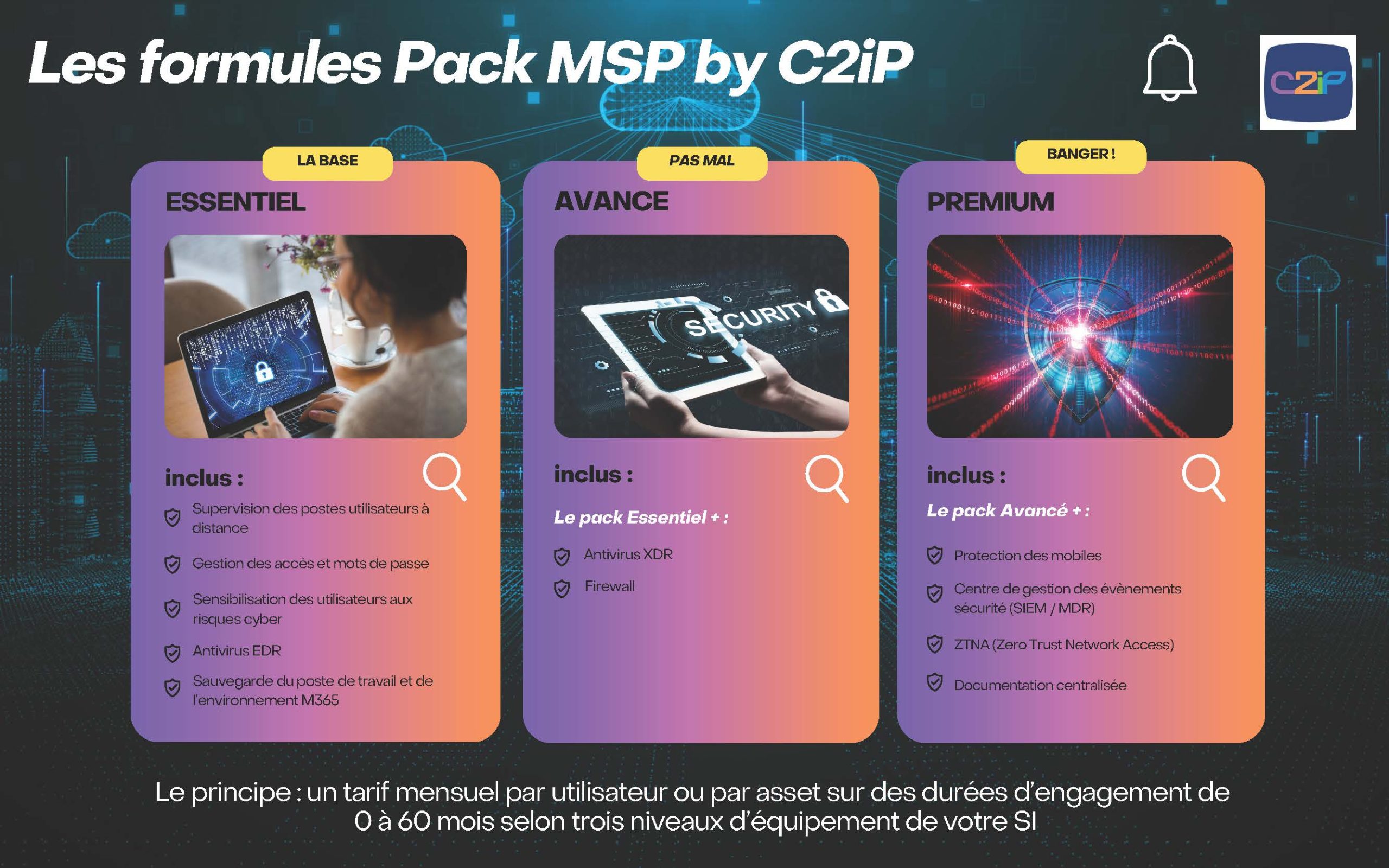 Pour répondre précisément à vos besoins et à votre niveau de maturité en cybersécurité, nous avons conçu les packs CyberMSP by C2iP, disponibles en trois formules évolutives : Essentiel, Avancé et Premium. Chaque pack regroupe un ensemble de services clés en matière de protection des postes, des accès, des données et des infrastructures, jusqu’à la supervision centralisée (SIEM), la protection mobile ou encore l’approche ZTNA (Zero Trust Network Access).